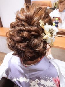 こちらは着物でのアップでしたが、緩めの雰囲気にしたいというご要望でしたので、結婚式のお洋服での参列、浴衣にも使えるヘアーアップです♪